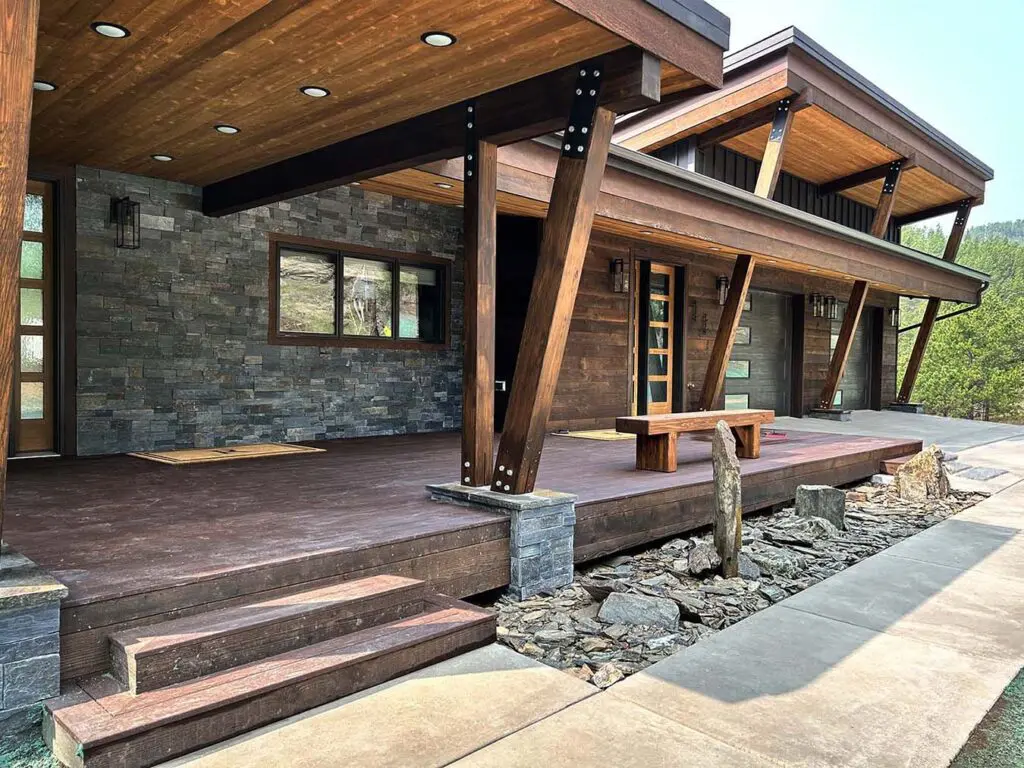 The Gimlet Bench House is built on a gorgeous forested bench, above the Michelson Trail. The modern home features beautiful wood beams, masonry, and a unique roof line.