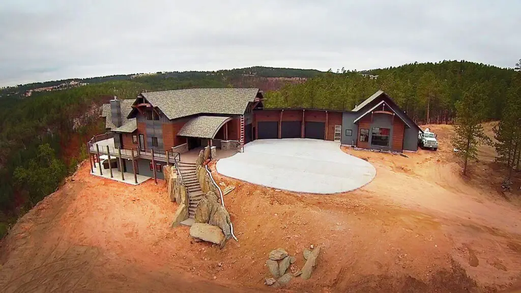 The Neck Yoke Heights Home is perched on a beautiful canyon edge with views of the Hills to the west and the plains to the east. The house features large, wood beams and metal-paneled siding.