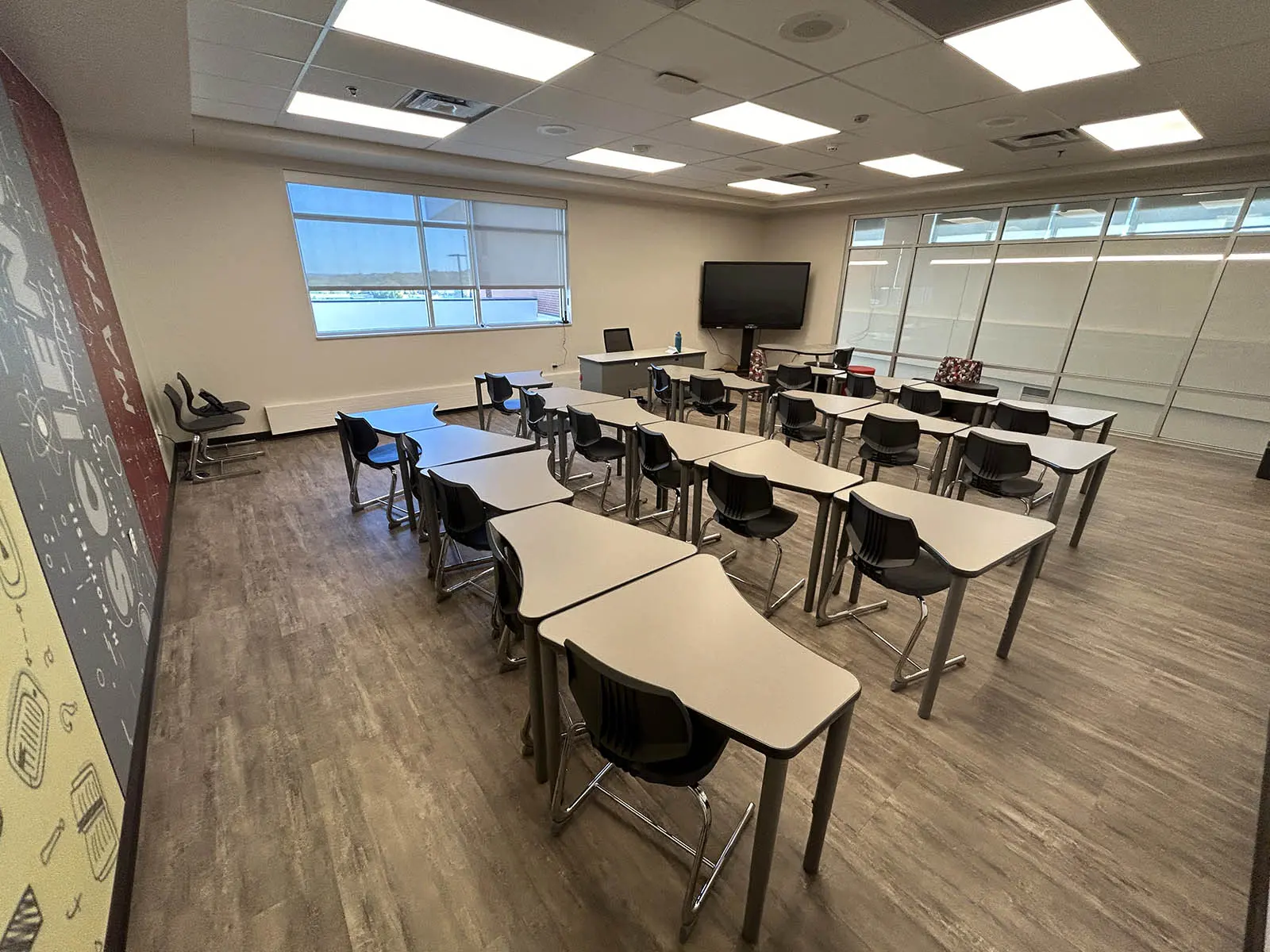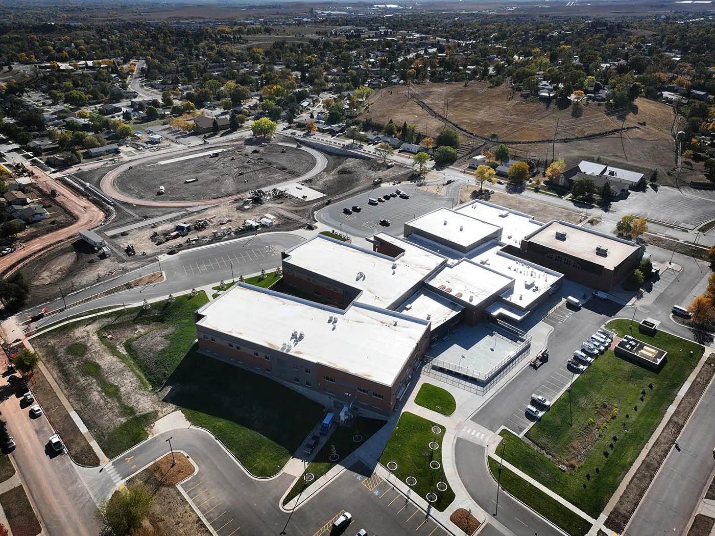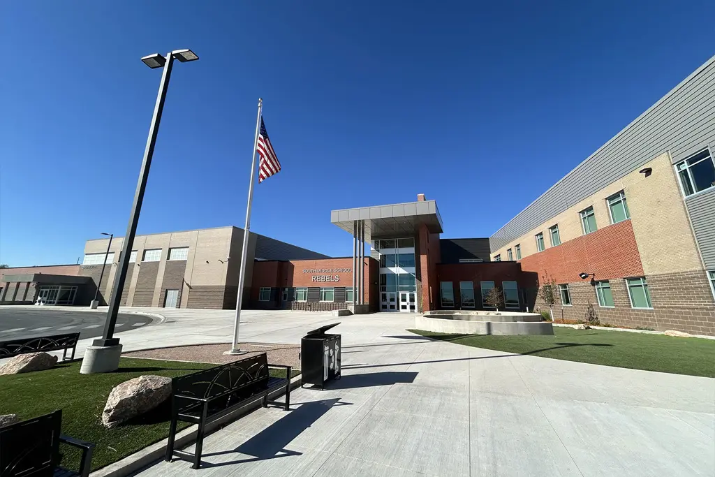 The Rapid City Area School District has a new middle School on the southeast part of the City. The modern facility has numerous features to enhance the student experience. Along with standard classrooms with multiple break-out spaces, the school boasts a CTE Production Lab, dedicated STEM Classrooms, large Band/Music Room, Orchestra Room, , Family and Consumer Sciences (FACS) Classroom, and a 300-seat Commons with stage and production capabilities. The Special Education program has specialized spaces including a Simulated Home Training Area. Sports facilities include a competition gym with large locker rooms and a referee/officials locker room, a fitness center, and a new outdoor track and football field. Multiple entrances relieve pressure at any one entrance. A large crawl space houses all of the mechanical including the Geothermal and Ice Storage Systems that make up the High Efficiency HVAC.